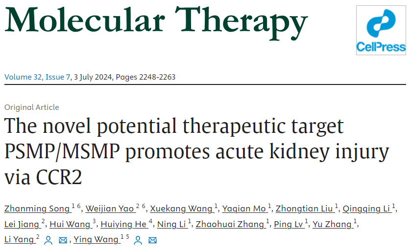 近期,北京大学基础医学院王应教授联合北京大学第一医院肾内科杨莉教授的研究团队在Molecular Therapy上在线发表题为“The novel potential therapeutic target PSMP/MSMP promotes acute kidney injury via CCR2”的最新研究成果,首次揭示上皮源性趋化活性细胞因子PSMP通过CCR2在AKI中发挥关键作用,为AKI治疗提供新的潜在靶点和PSMP抗体药物。